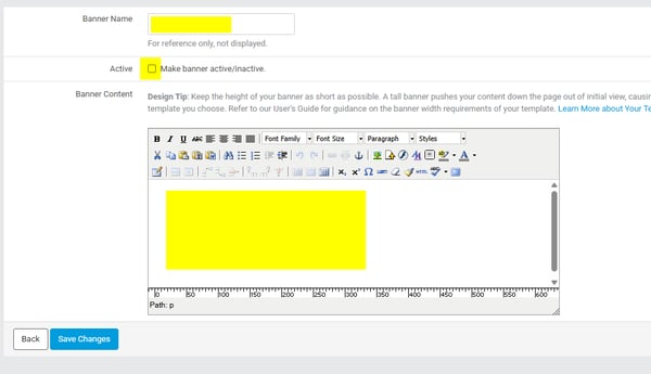 - Enter the banner name, select the "Active" box, and enter and format the text in the Banner content section.