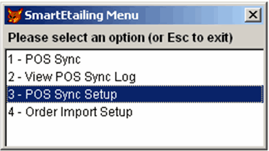 - Select 3 - POS Sync Setup from the SmartEtailing menu