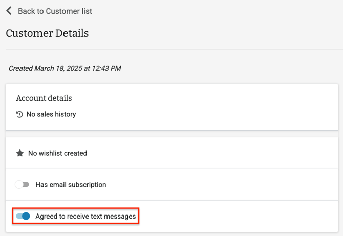 - The customer may reply to any text with STOP to opt out of future texts, and the "Agreed to receive text messages" toggle on the customer record will be set to "off".