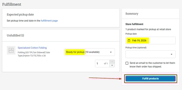 - For in-store pickup orders, select "Ready for pickup" in the drop-down menu, select the pickup date, and then click "Fulfill products".