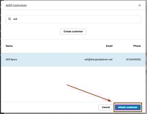 - Use the search bar under Attach customer to search by first name, last name, email address, or phone number. Search results will appear as you type.