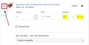 - Click the down arrow next to the product to adjust quantity and price, add a discount, mark the product as special order, and/or change it's taxability.