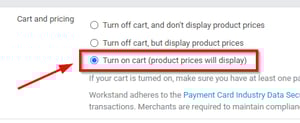- In the "Cart and pricing" section, select "Turn on cart (product prices will display)".