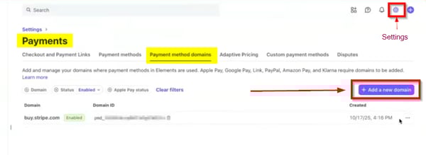 - To verify your domain(s) in Stripe, log in to your Stripe account and navigate to Settings > Payment methods > Payment method domains, and click "+ Add new domain".
